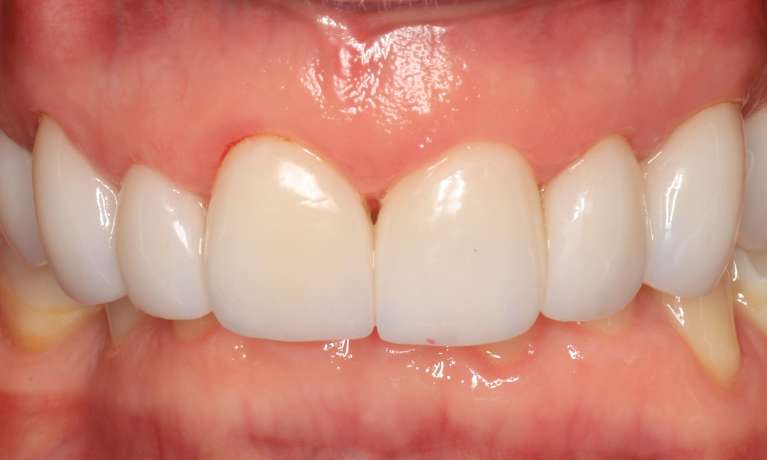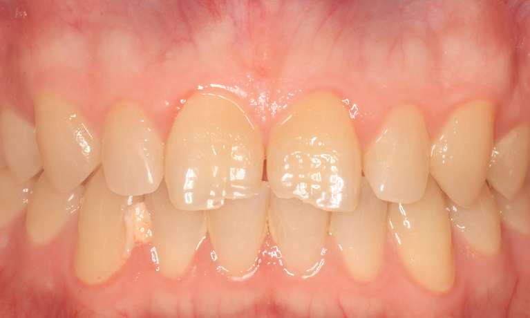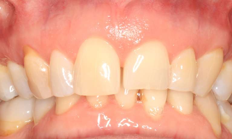 The patient presented with a missing upper left lateral incisor, a peg-shaped lateral incisor, and an over-retained baby canine. The goal was cosmetic improvement which was achieved by extracting the baby canine and using braces to move the adult canine into its correct position, while creating space for the missing lateral incisor. Once orthodontic treatment was completed, tooth colour was brightened with teeth whitening. The peg lateral incisor was reshaped to look like a normal tooth, and the missing tooth was replaced with a bonded bridge.