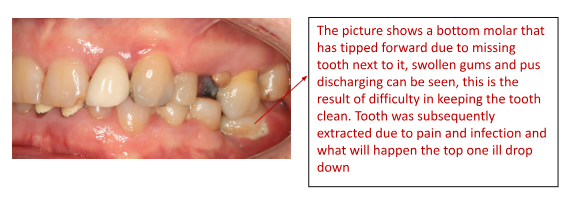 Teeth in the mouth can be likened to books in a bookshelf tightly packed from one end to the other. Imagine taking one or two books from the middle of the shelf. What happens is the books will now tip or fall. Similarly, removal of one tooth will lead to tipping of others. Also, this creates areas that are hard to clean. Bacteria will collect under the gum, and eventually this dissolves bone, causing gum disease. This also is a painless process until one day the tooth will wobble or start to ache, leading to extraction. Therefore, removal of one tooth will almost lead to loss of the adjacent tooth. Tipping of adjacent teeth following extraction can be prevented by replacing the missing tooth with a dental implant.