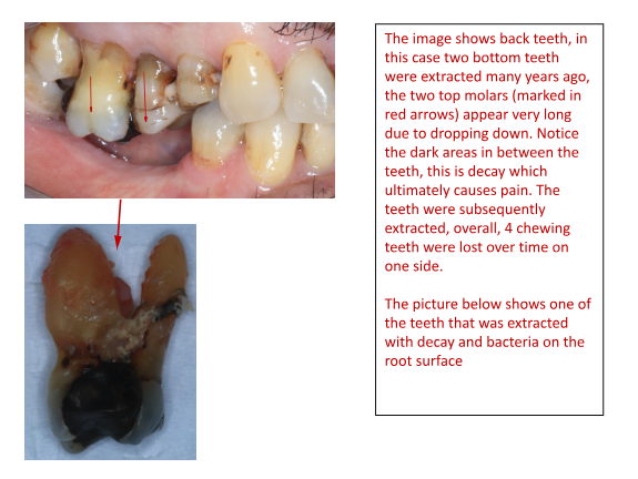 Overeruption means dropping down of the tooth. This is common with top back teeth following the loss of the bottom one(s). This is a painless process. Slowly, the tooth leaves bone and grows down, thus becoming difficult to clean. Eventually, this leads to decay and gum infection around the tooth that creates pain, leading to extraction. Removal of a back tooth/teeth now will almost lead to loss of opposing tooth/teeth in the future, and this will increase the cost of replacing teeth in the future. Therefore, it is encouraged to replace a lost tooth to maintain bite, alignment, and preserve chewing ability. This will also prevent further loss of teeth down the track. Dental implants are an effective and predictable method of replacing missing teeth.